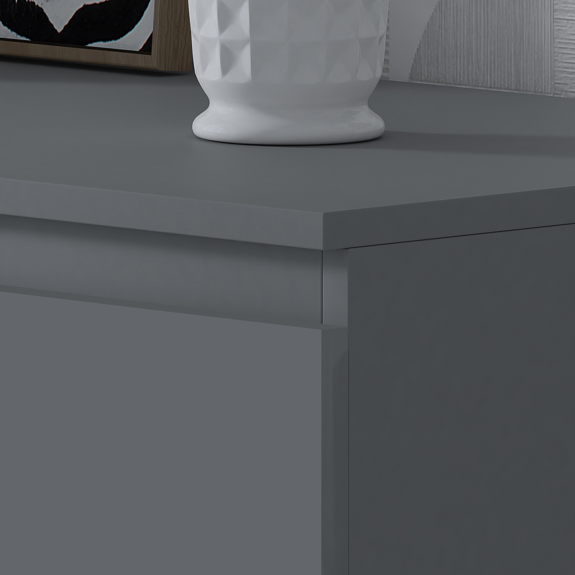 The Carlton Matt Dark Grey 8 Drawer Wide Chest is the epitome of modern elegance and practical design, crafted to meet the highest standards of contemporary styling. This exquisite piece, with its modern matt Dark Grey finish, commands attention and brings a sophisticated edge to any room. Built from superior quality MDF composite board, it assures durability and stability. The surface is further enhanced with a plastic veneer and an additional melamine coating, making it scratch-resistant and UV-protected to maintain its sleek appearance for years. The metal drawer runners are designed for sleek and smooth access, allowing for effortless operation without the need for handles, which contributes to its clean, minimalist aesthetic.