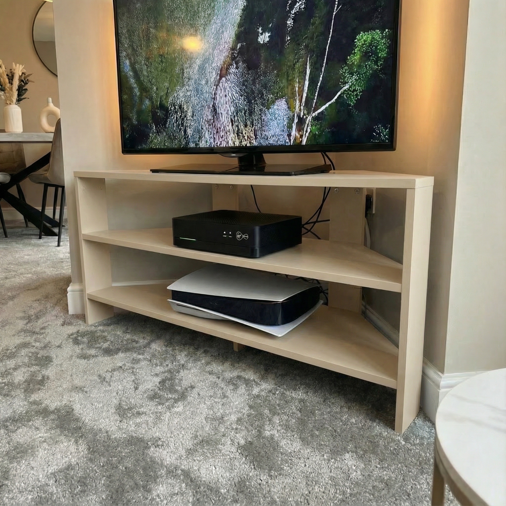 The FWStyle Promo Putty Beige Corner TV Unit is a smart and practical media solution designed to maximise space without compromising on style. Its compact corner-friendly shape allows it to sit neatly into the corner of any room, making it ideal for smaller living rooms, bedrooms, apartments, or student accommodation.