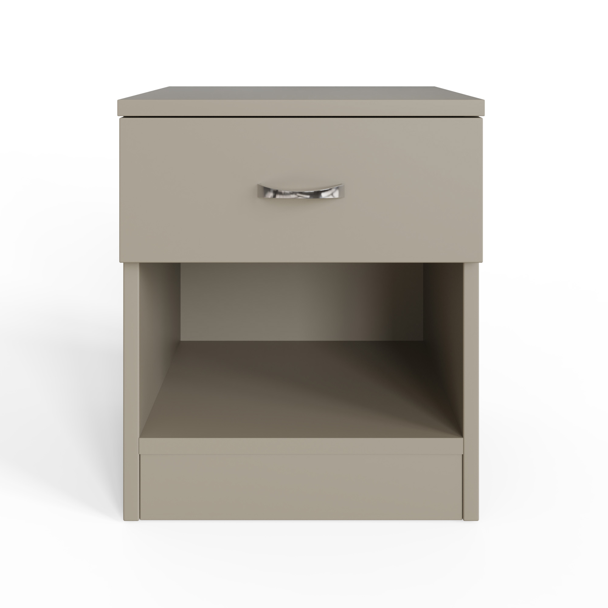Built with durable materials and a scratch resistant melamine coating, the Promo Nightstand is designed to withstand daily use while maintaining its smooth, stylish appearance. The chrome effect handle adds a modern accent that perfectly complements the Putty tone, bringing a touch of understated sophistication.