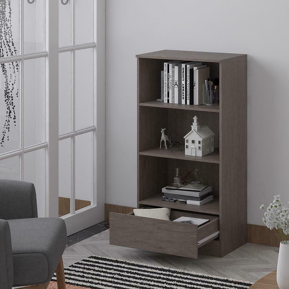 Rustic Oak Finish 3 Shelve Bookcase with Bottom Drawer is ideal for any living room or office environment.