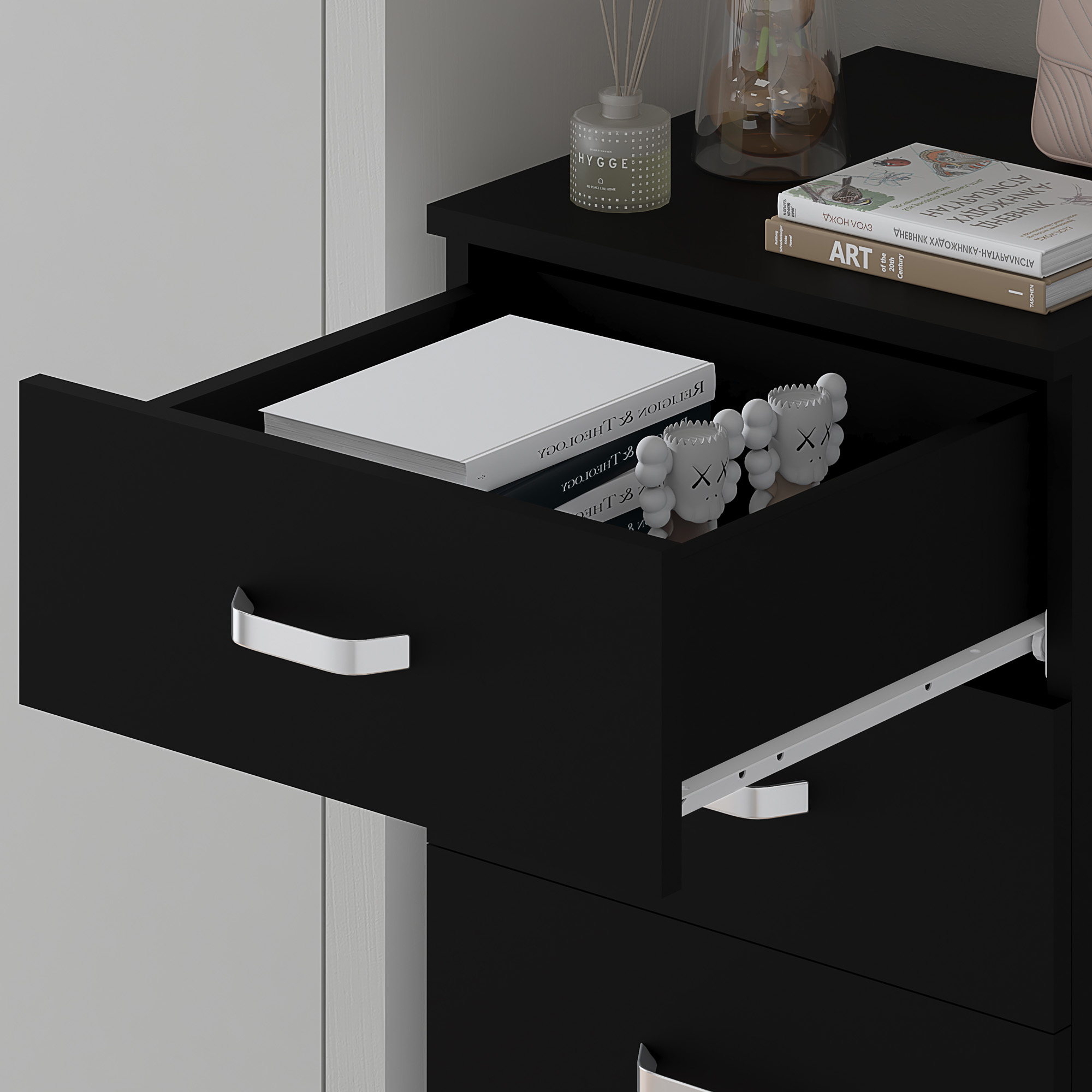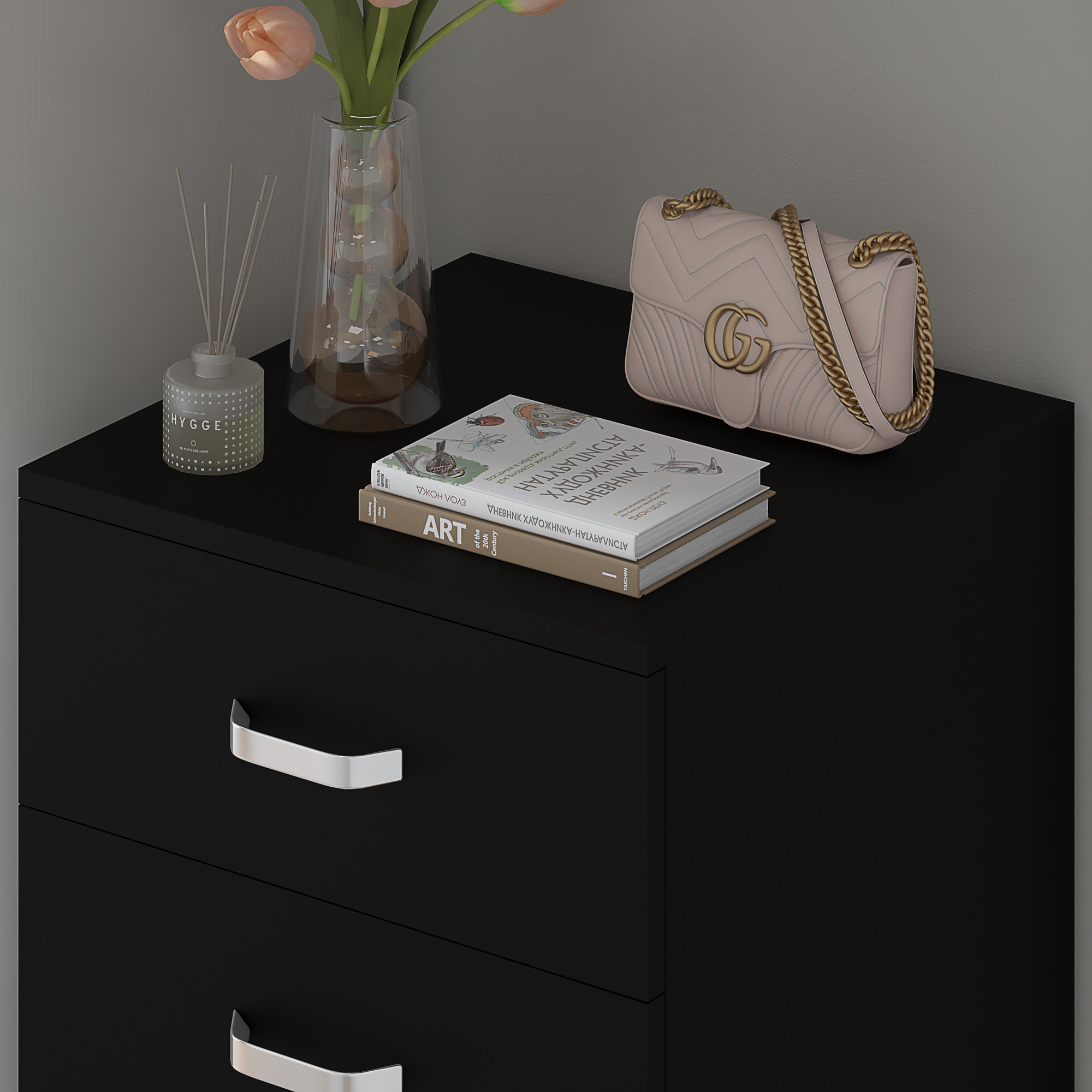 Crafted with quality in mind, this chest of drawers boasts five spacious and deep drawers, providing ample storage for your clothing, accessories, or any other items you wish to keep organized. The drawers effortlessly glide open and closed, thanks to the smooth metal runners, ensuring easy access and a hassle-free user experience. Available in Matt White, Matt Grey, and Matt Black, this chest complements various interiors while maintaining a luxurious feel. The metal bow handles add a touch of contemporary style, offering sturdy functionality and enhancing the chest’s visual appeal.